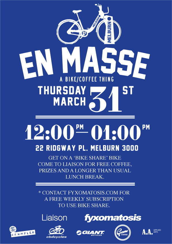 Melburn's first Bicycle FLASHMOB event at Liaison Cafe promoting the Melbourne Bike Share program. Over 200 people popped up on the blue bikes for a coffee and good time.