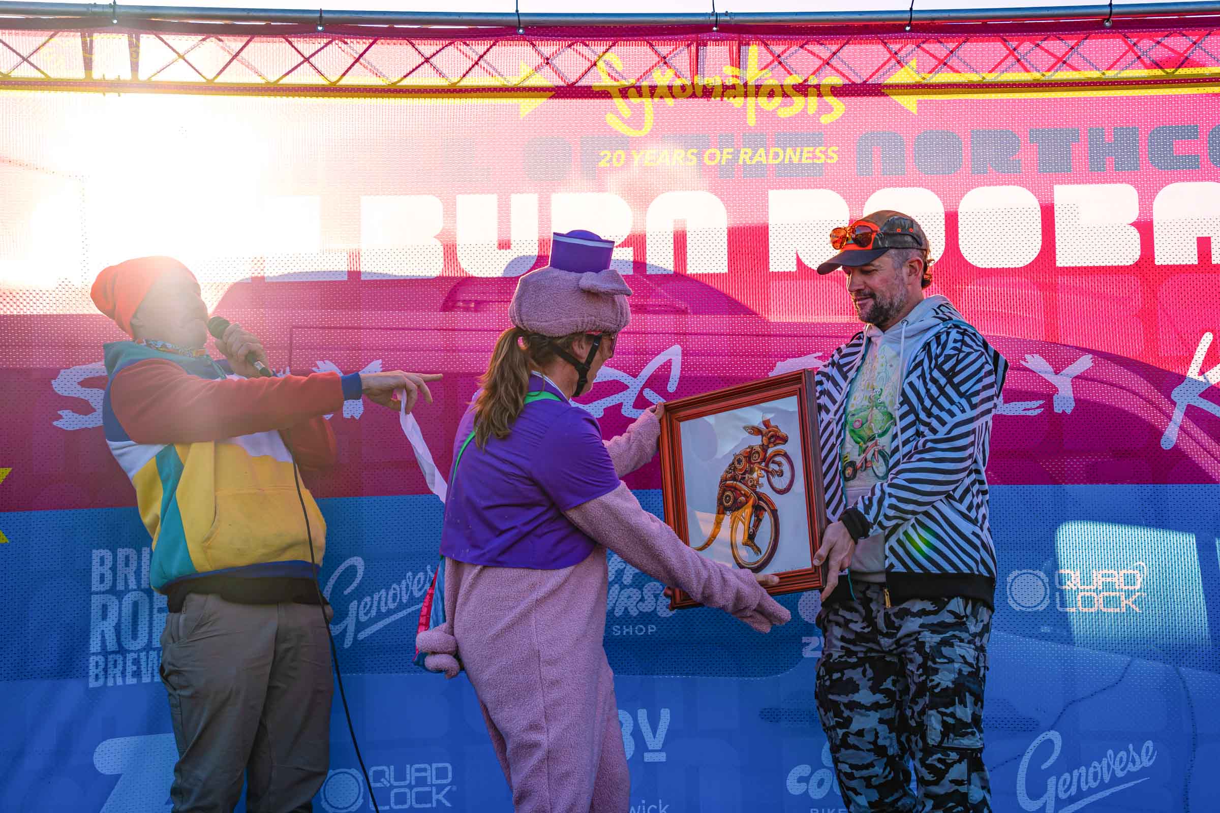 From one Roobaix legend to another. Once again, Michael 'Makatron' McInerney gifted a framed print of an original artwork - awarded to Shelley McColl aka Lightning McStitch.