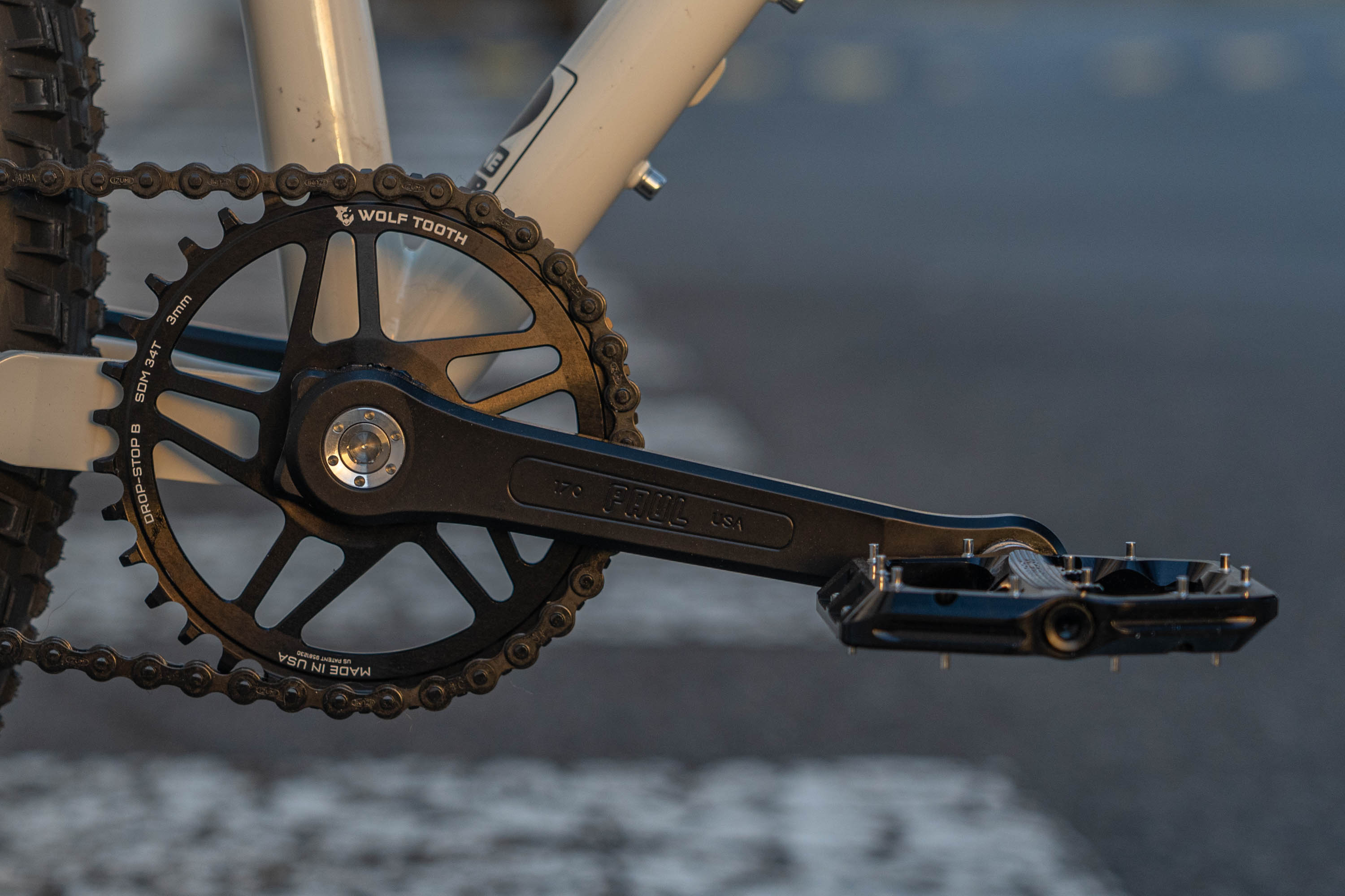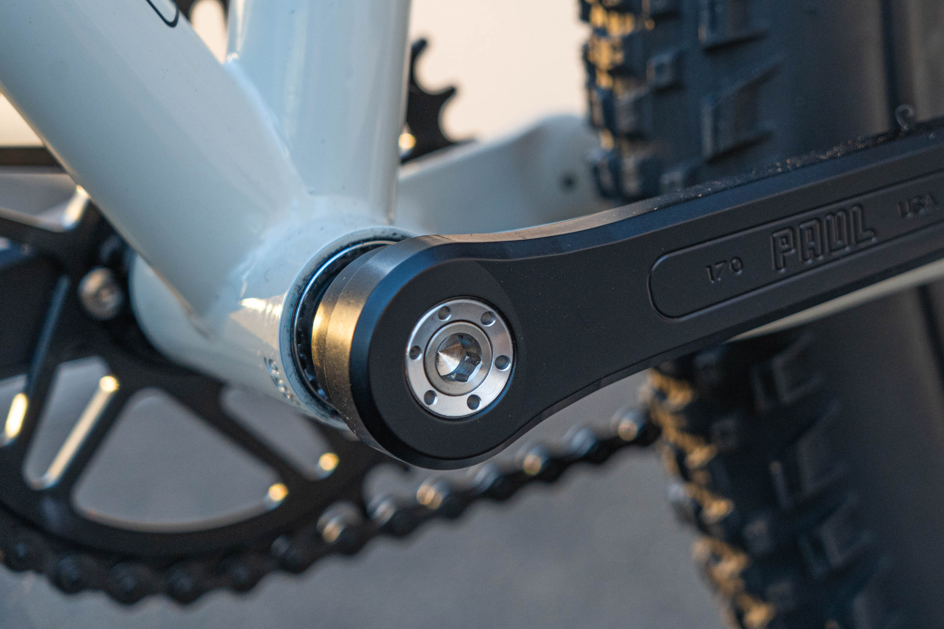 The Paul Components cranks are just stunning. Classic in design, beautifully machined and industriously anodised so they won't fade in the sun. Bolted to them is a Wolf Tooth Chainring, who also provide the pedals, titanium cage, ergo grips and bar ends.