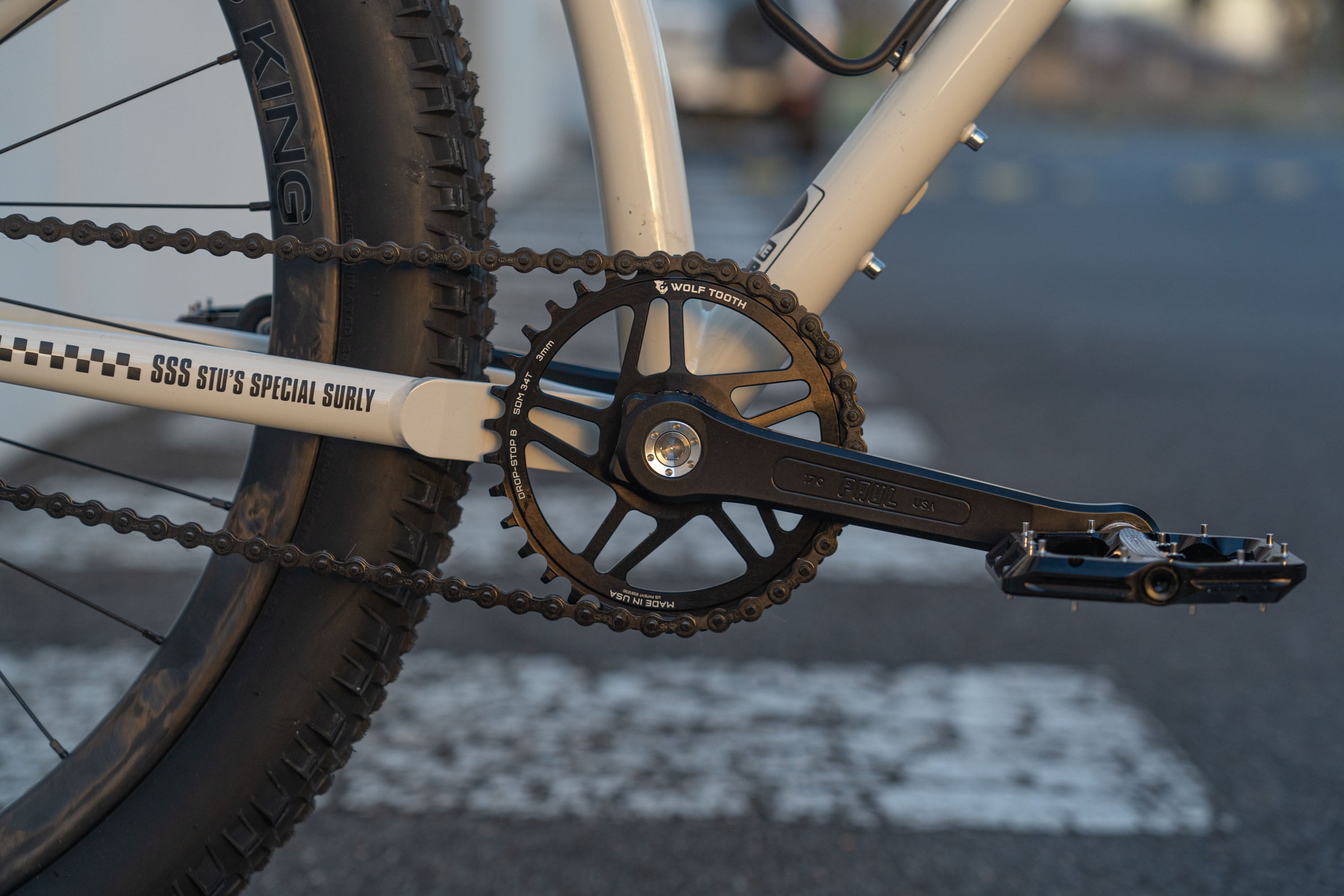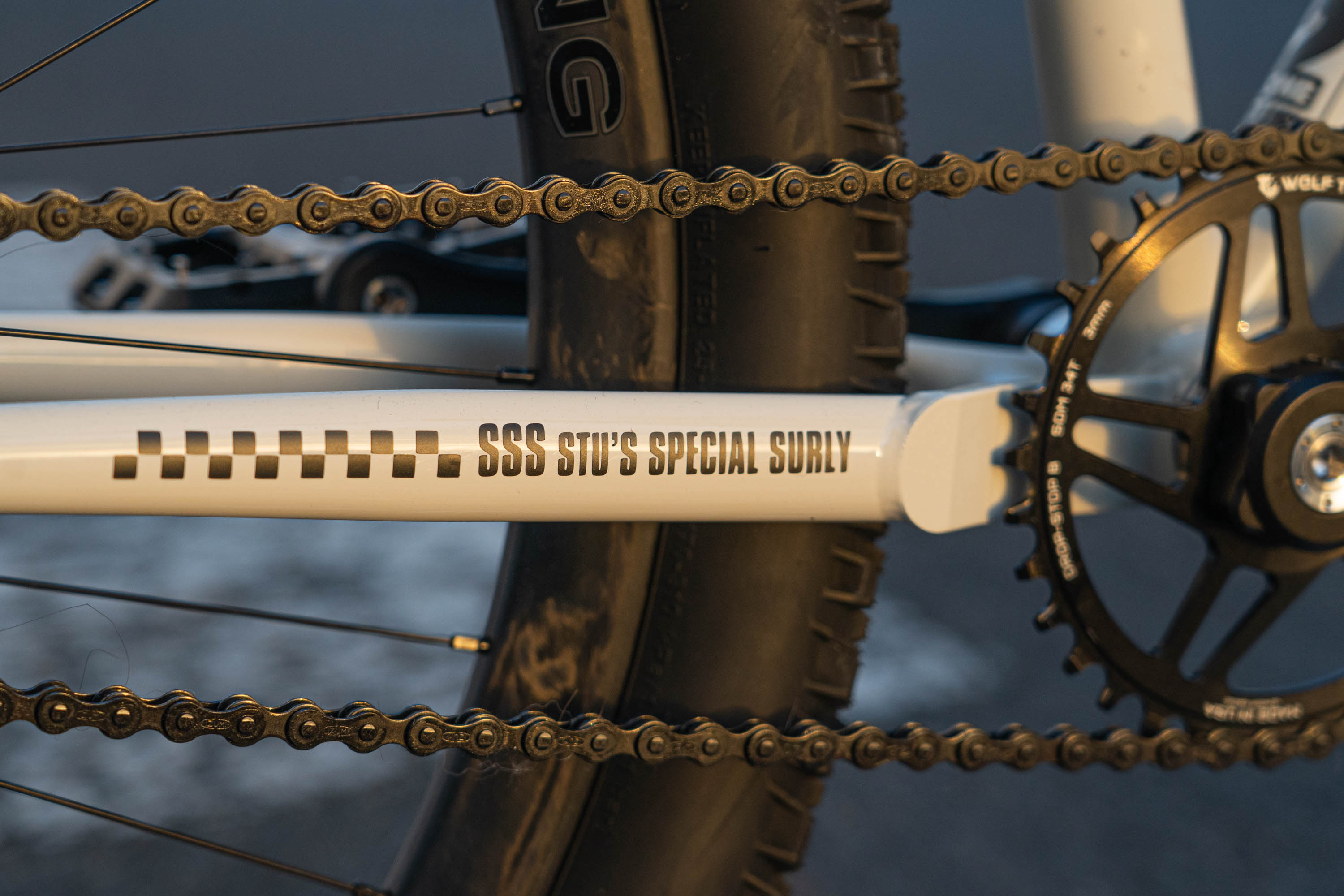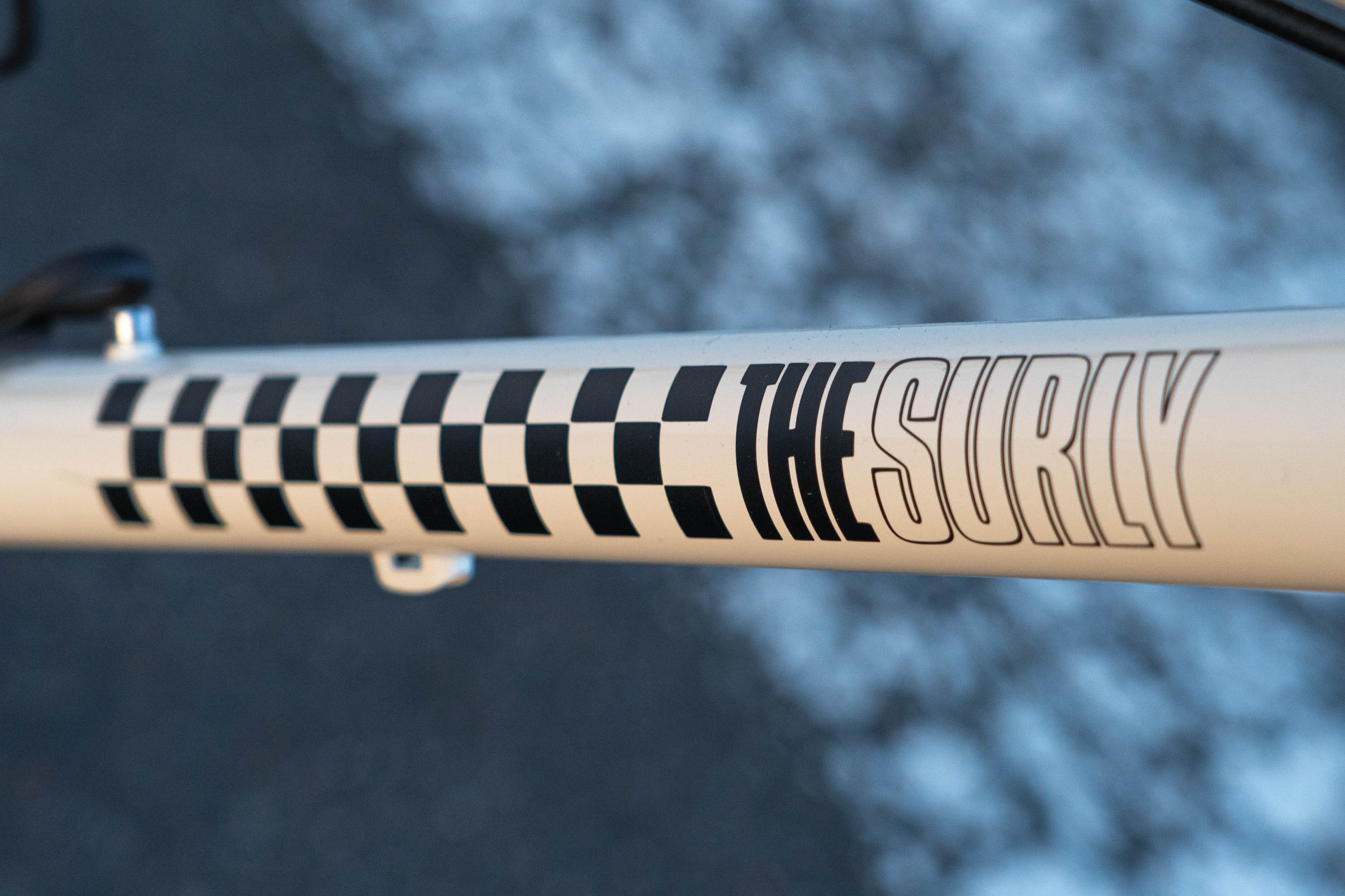 Icons on THE SURLY were pulled from the typography, symbolism and style of The Specials which features a design element ubiquitous with speed - the checkered flag!It was only after giving the owner a preview of the bike that I had a brain fart of adding a band of checkers to the rear hub. Simple, stylish and speedy!