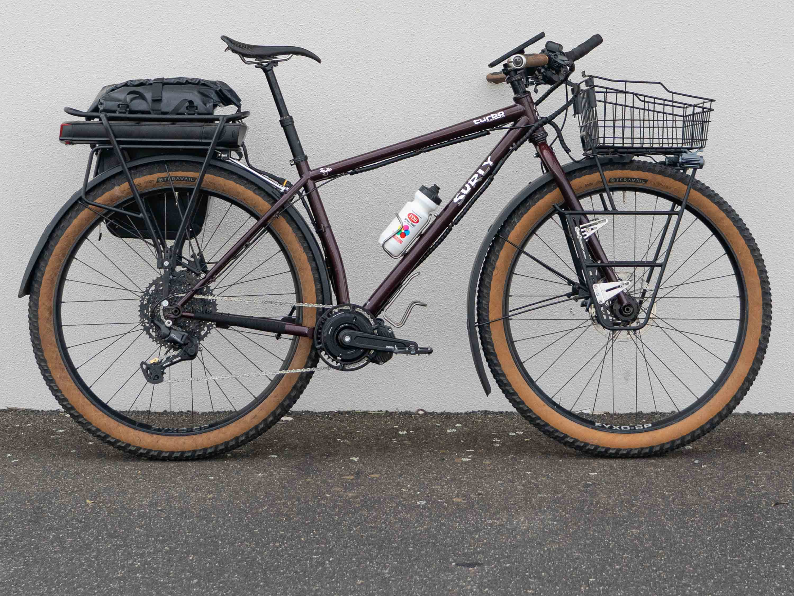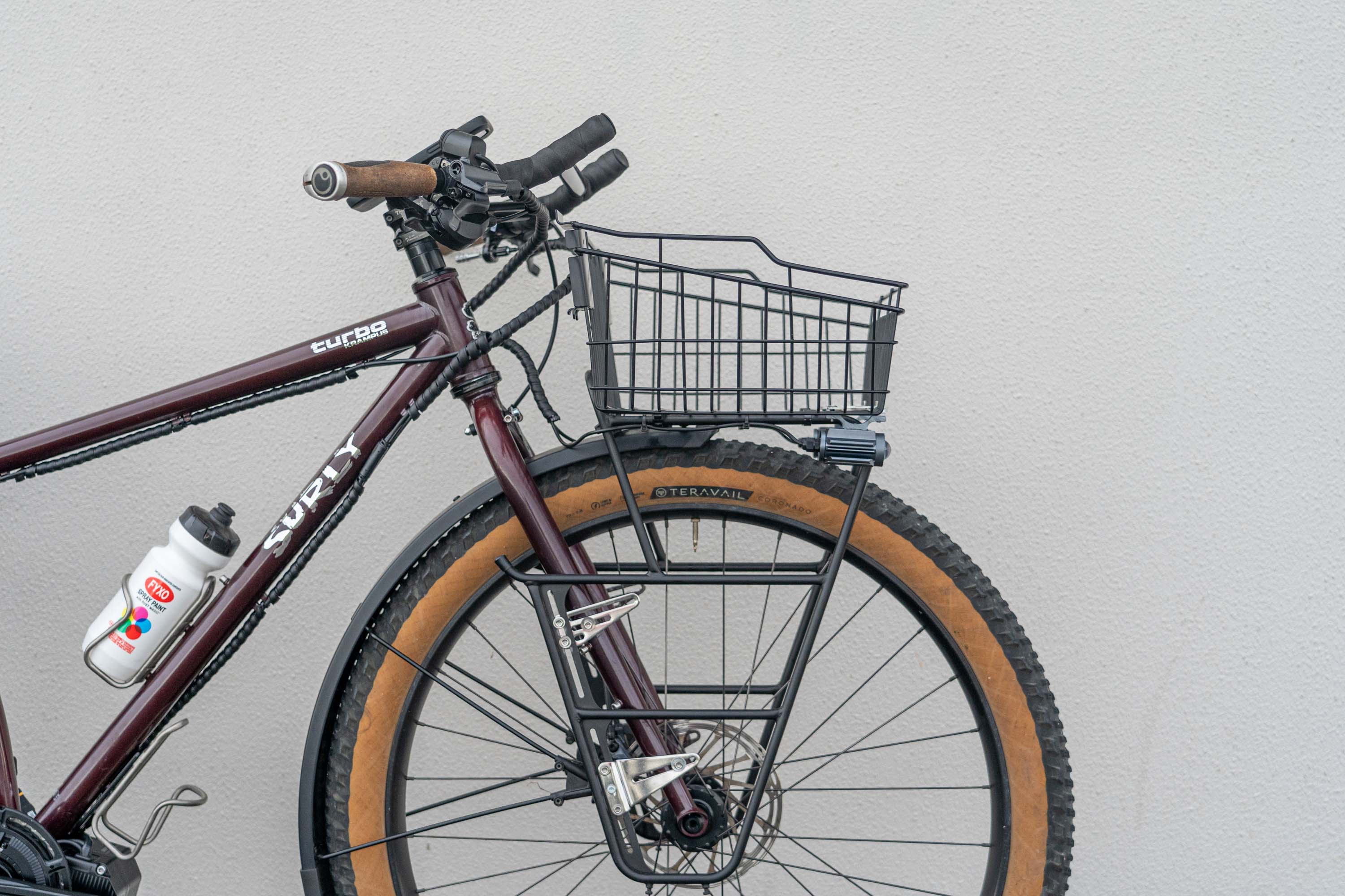 The front Surly Rack is rated to 32kg, more than enough for a backpack or case of wine.